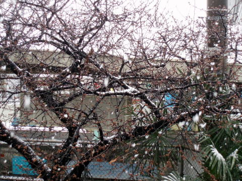 当店目の前にある、寒桜。 早々にたくさんの蕾をつけた寒桜の枝に、うっすらと雪が積もったところをパチリ