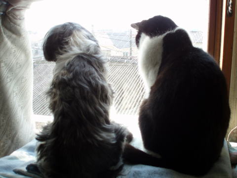 写真を掲載ついでに、今朝『ごん』と『ぶっちゃん』が何やら窓の外を眺めていたところをパチリ